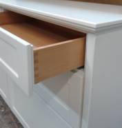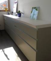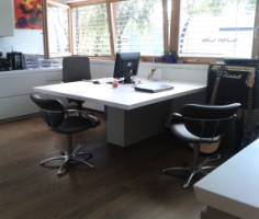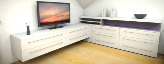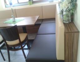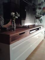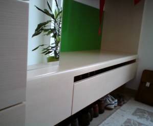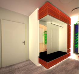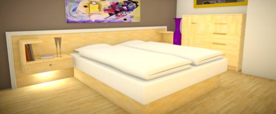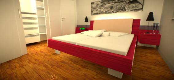 x Rechts: Garderobe aus Pallisander. Sitzfläche mit Leder tapeziert. Spiegel schwebend montiert. Links: Garderobendetail Schlafzimmer mit begehbarem Kleiderschrank. Zirbenbett geölt. Moderne Gestaltung.